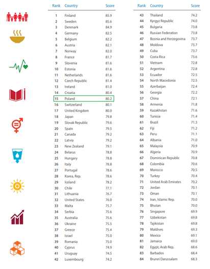 W 2021 roku, Polska zajmowała 15 miejsce na 165 państw, jeśli chodzi o realizację Agendy 2030. w 2020 byliśmy na 23 miejscu